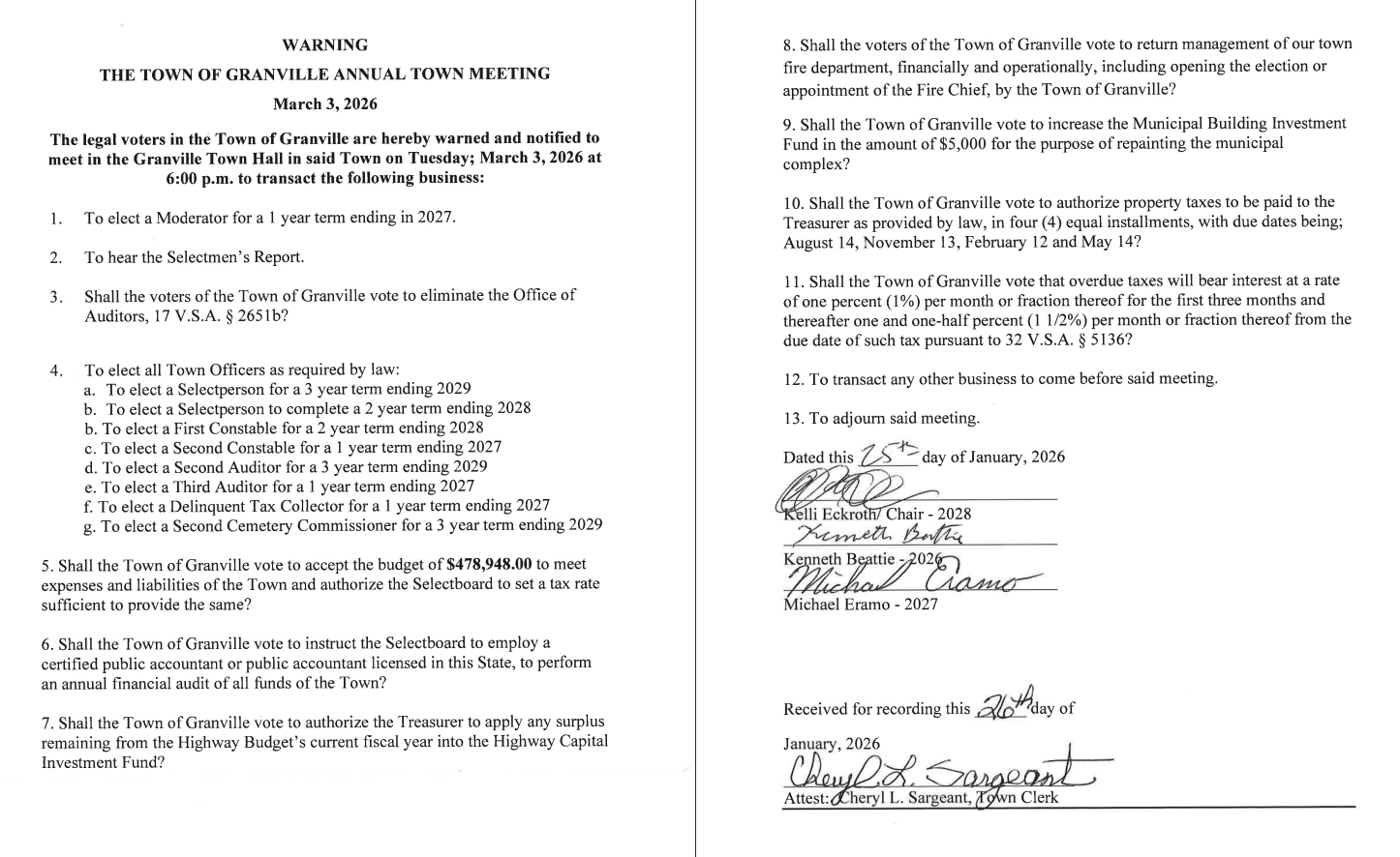 The Granville Selectboard has approved a state mandated town-wide reappraisal for the 2026 Grand List. The Town Assessor will begin site visits in January 2025. The purpose is to verify the current interior and exterior information of your property to determine its fair market value. The last time a town-wide reappraisal was completed was 2008. A letter will be sent to all property owners prior to any site visit outlining the reappraisal process. If you have any questions, you may contact the Town Assessor, Richard Favor at 802-770-4774.