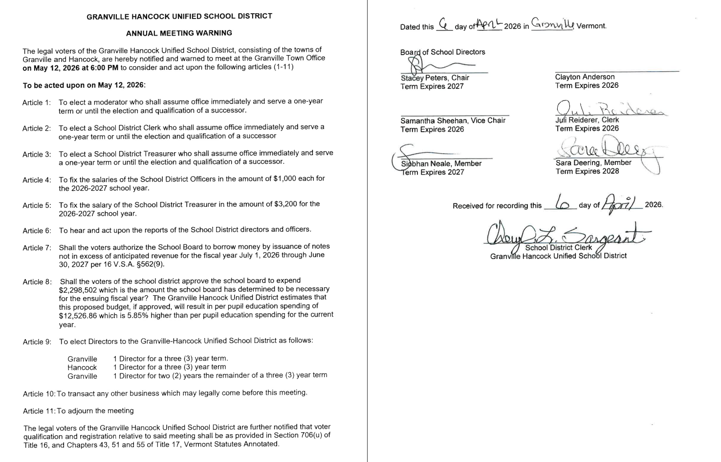 WARNING – GHUD ANNUAL SCHOOL MEETING – TUESDAY, MAY 12, 2026 @ 6 PM